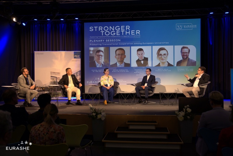 The plenary session brought together Sofie Mols, Vice-President for Innovation and International Relations at the Thomas More University of Applied Sciences in Belgium; Andrean Lazarov, Quality Assurance Officer at the University of Agribusiness and Rural Development in Bulgaria; and Michael Roither, Vice-Rector for International Relations at the University of Applied Sciences in Burgenland, Austria, for a joint debate. The plenary session was moderated by Mr. Michal Karpišek, former Secretary General of EURASHE, representative of the European University Alliance E³UDRES² and the University of Applied Sciences of St. Pölten in Austria.