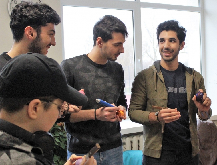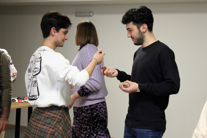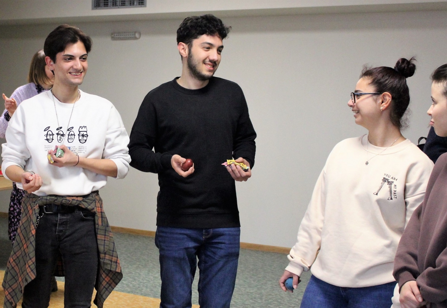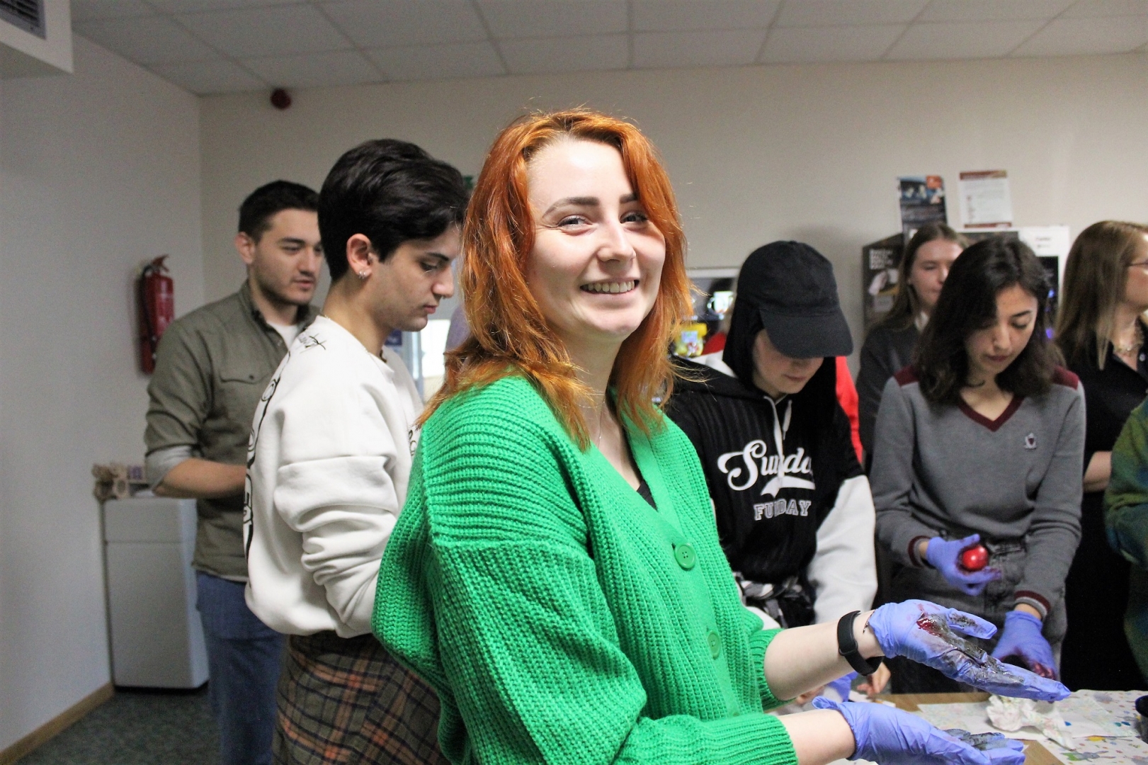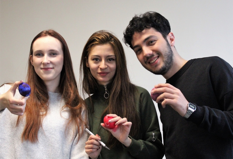„Erasmus+“ studentams iš Turkijos tai buvo pirmoji pažintis su Velykų tradicijomis! Šventės metu „Erasmus+“ studentai mokėsi dažyti kiaušinius perlamutriniais dažais, raižyti ornamentus ant jau dažytų kiaušinių. Svečiai pamatė, kaip atrodo kiaušiniai, dažyti raudonu vynu, susipažino su tradiciniu kiaušinių dažymu svogūnų lukštais ir pavasariniais augalais. Savo rankomis dažytus kiaušinius studentai taip pat galėjo papuošti ir linksmais lipdukais.