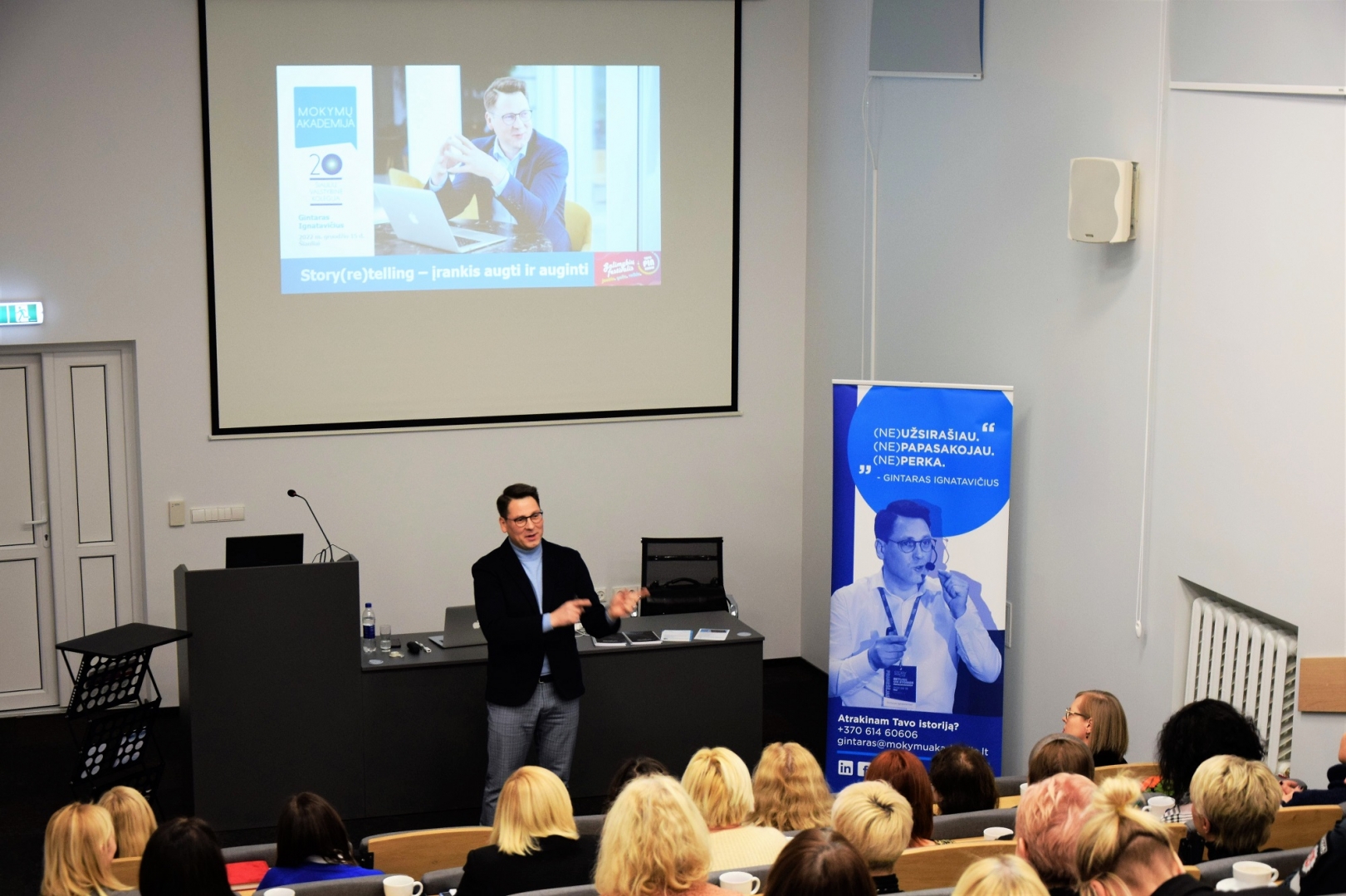 Paskaitos lektorius Gintaras Ignatavičius – storyselling'o pradininkas Lietuvoje, „Mokymų akademijos“ įkūrėjas, parduodančių istorijų klubo „StorysellingLAB“ įkūrėjas ir konferencijos RETURN ON STORIES organizatorius.