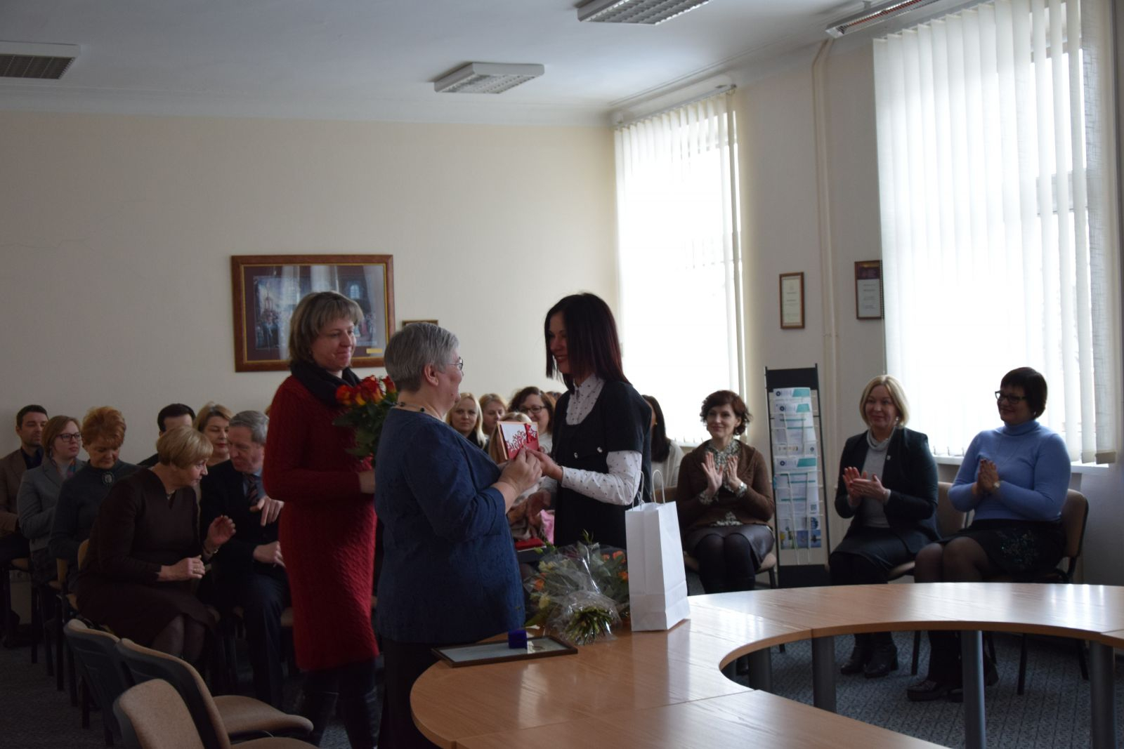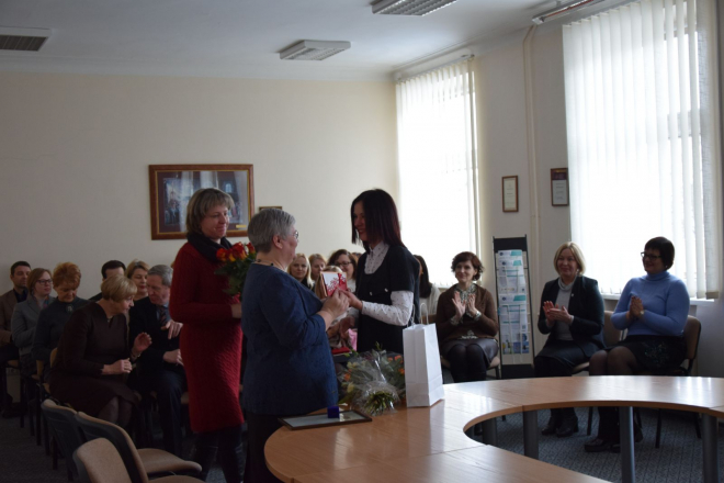Šiaulių valstybinės kolegijos direktorė dr. Natalija Šedžiuvienė, sveikindama dėstytoją, prisiminė svarbiausius lektorės profesinius žingsnius, džiaugėsi svariu indėliu į puikių specialistų parengimą, linkėjo dar ilgai žiniomis dalytis su kolegomis ir studentais, drauge puoselėti aukštą švietimo sistemos kultūrą.