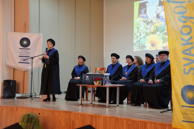 Kolegijos direktorė dr. Lina Tamutienė, sveikindama studentus, atkreipė dėmesį, kad rankose laikomas profesinio bakalauro diplomas liudija apie studijų metų įgytą supergalią – žinias ir įgūdžius, įvairias patirtis, kurios atveria duris tolimesniam profesiniam ir asmeniniam augimui. Kolegijos vadovė džiaugėsi, kad išleidžiama studentų karta, specialistai, kurie bus arti žmogaus, prisidės prie žmonių gerovės. Pasitelkdami atidumą, empatiją ir pagalbą jie tampa tais, kurie padeda kitiems įveikti įvairiausius gyvenimo iššūkius.