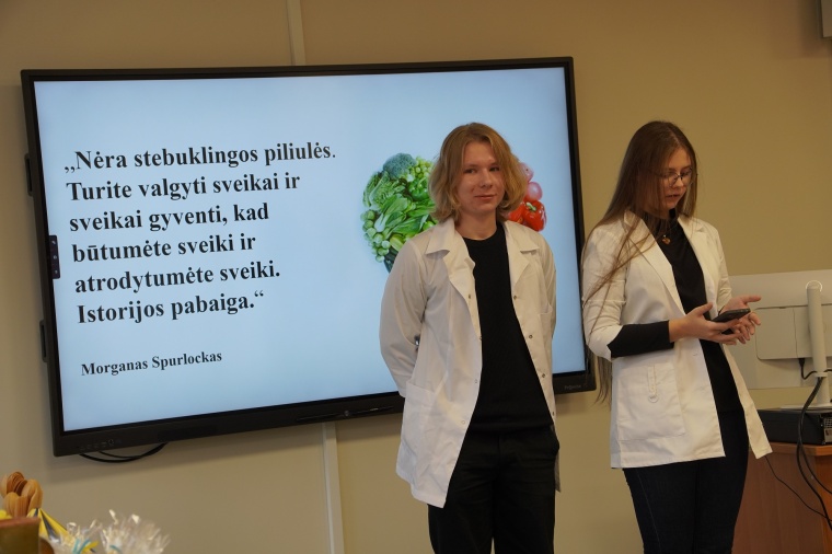 Renginio vedėjos – Kineziterapijos studijų programos studentės Gabija ir Gustė – pateikė faktų apie sveiką gyvenseną, pasidalijo patarimais geros savijautos tema. Studentės akcentavo sveiką mitybą, nes maistas yra svarbus ligų profilaktikai ir sveikatos stiprinimui.