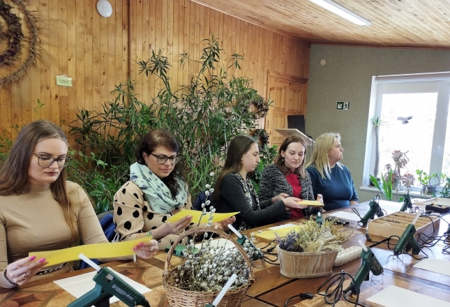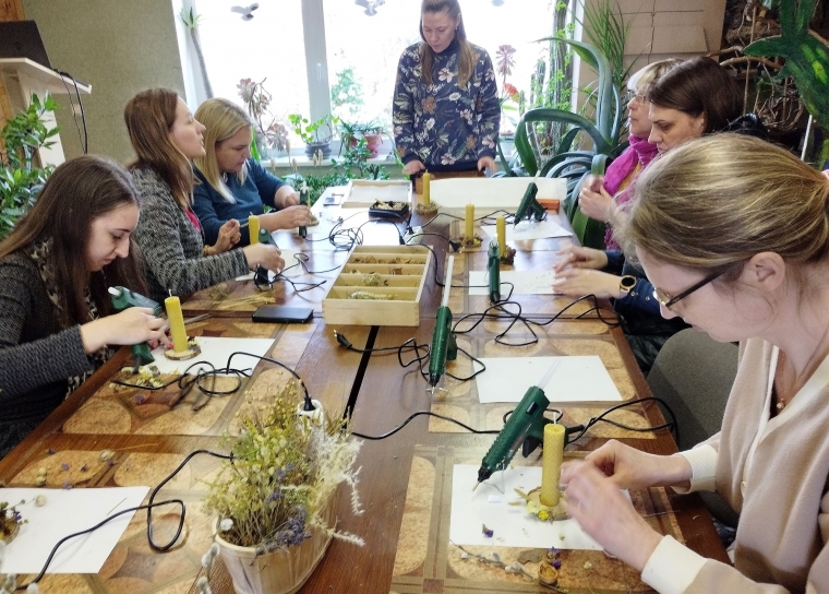 Popietės pradžioje administratorių laukė malonus užsiėmimas akims ir sielai – žvakidės edukacija VU ŠA Botanikos sode. Visos renginio dalyvės turėjo galimybę pasigaminti natūralaus bičių vaško žvakę ir jai skirtą žvakidę. Žvakidės gamybai naudotos natūralios, gamtoje randamos džiovintos medžiagos. Po edukacijos jos dalyvės džiaugėsi individualiomis, išskirtinėmis, atspindinčiomis kiekvienos autorės bruožus žvakidėmis. Po vieną padėkos žvakidę už nuostabią popietę komandiškai pagaminta ir abiem fakultetams. Pabaigus kūrybinius procesus laukė kavos pertraukėlė su pokalbiais, padėkos žodžiais ir dovanomis.