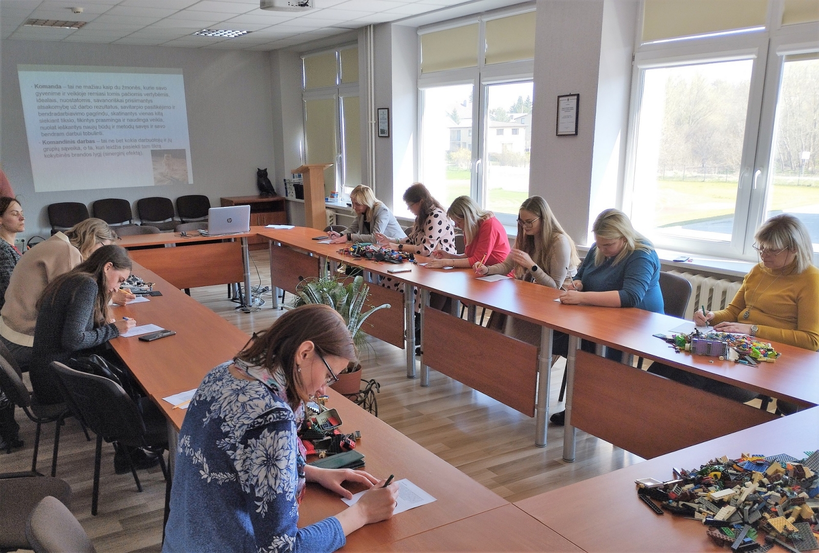 Užsiėmimo metu nebuvo laiko nuobodžiauti. Susipažinusios su komandinio darbo teorijos pagrindais, administratorės kibo į praktines veiklas. Seminaro metu imituota kelionė į mėnulį – tiek individualiai, tiek grupėse spręsta, kurie daiktai pravers norint išgyventi. Pasitelkiant LEGO per vieną minutę reikėjo sudėlioti skirtą užduotį ir po to rezultatą pristatyti grupės nariams. Pabaigoje dalyvės kūrė istorijas pagal išridentus kauliukus su paveikslėliais.