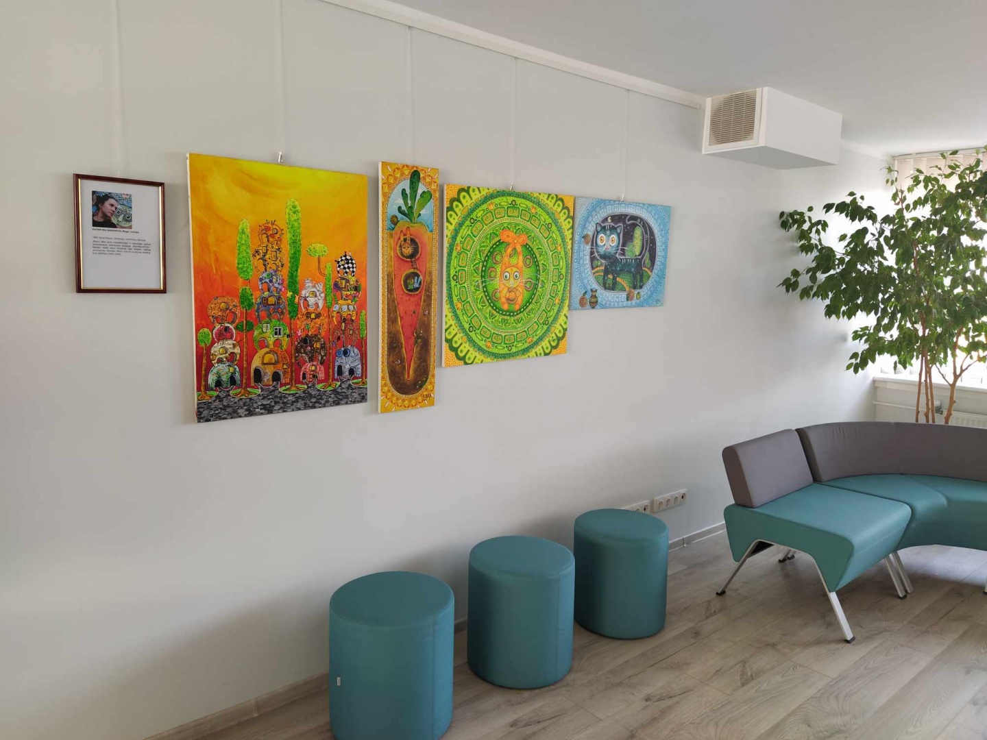 Kolegijos Bibliotekos ir savarankiškų studijų centre pavasariškai nuotaikai įkvepia Katerynos Baranovos (Ukraina) meniniai akcentai. Išskirtinai spalvingi akrilu tapyti darbai – tai animacinės istorijos, kuriančios pozityvią pasaką.