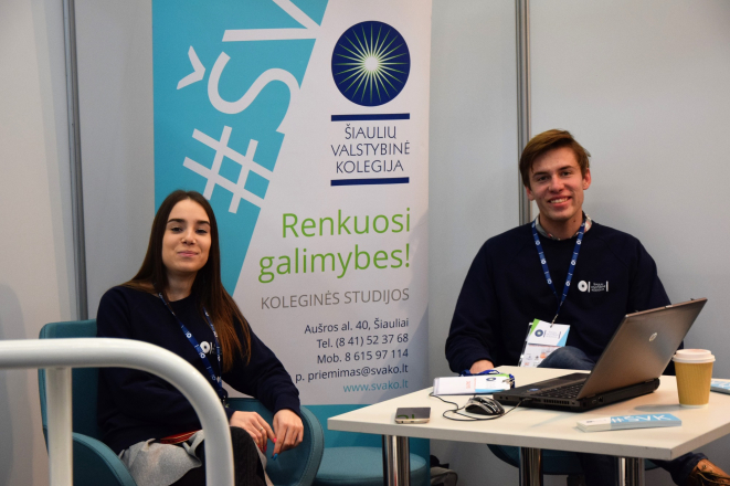 Šiaulių valstybinės kolegijos atstovus buvo galima sutikti ne tik prie kolegijos stendo – į parodą aktyviai įsitraukė Verslo ir apskaitos katedros studentai: tapę renginio savanoriais, jie padėjo organizatoriams atlikti lankytojų apklausą.