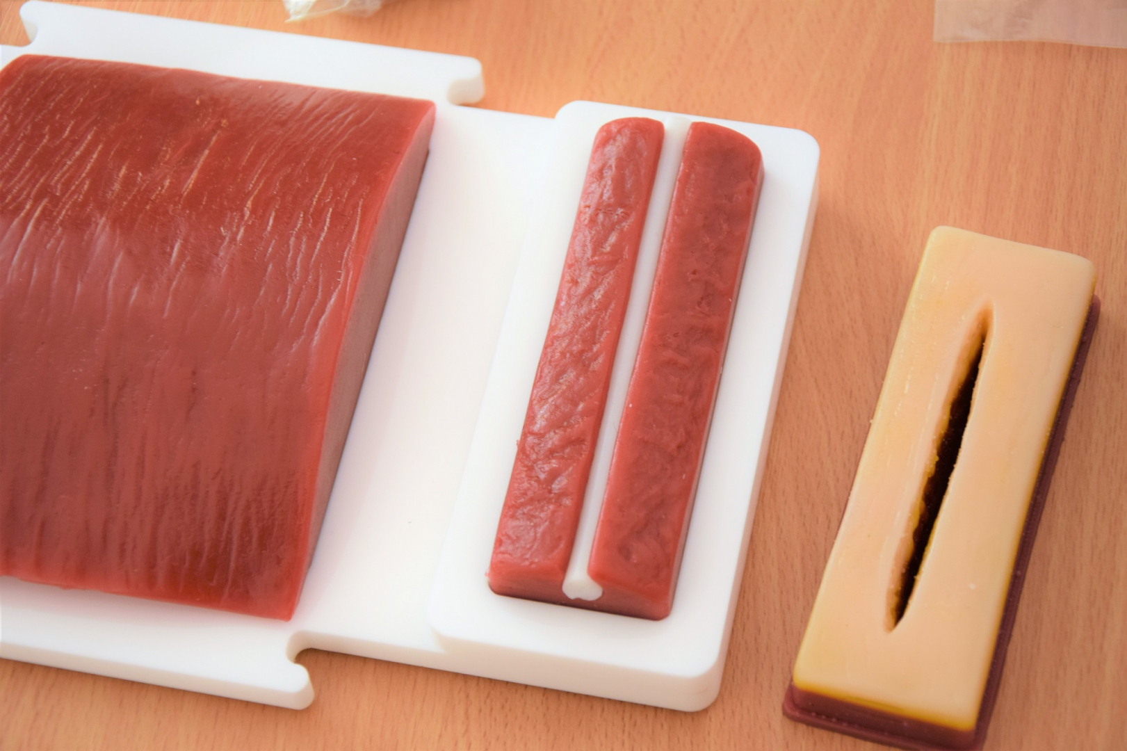 Studijų procesui, be abejonės, pravers žaizdų imitacijų rinkiniai, iš juose esančių cheminių medžiagų galima pagaminti dar daugiau labai tikroviškai atrodančių žaizdų variacijų. Muliažas žaizdų siuvimui – tai minkšta, lanksti trijų sluoksnių oda, kuri realiai atsiveria įpjovus, tačiau yra labai atspari plyšimui. Odos padas gali būti siuvamas šimtus kartų, vadinasi, juo pasinaudoti galės daug studentų. Dar vienas muliažas skirtas žaizdų siuvimui ir siūlių išėmimui, jį galima tvirtinti prie manekeno. Muliažui priklauso ir specialūs instrumentai.