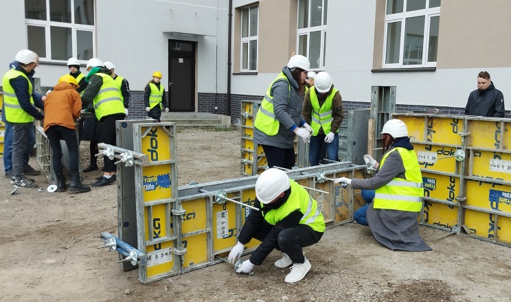 Komandos „Konstrukcijų virtuozai“ nariai Ernestas Liubinas (IS21 gr.), Modesta Vaišvilienė (S22 gr.) ir Anastasiia Lukoshius (S23 gr.) praktinėje užduotyje, kurioje reikėjo surinkti Doka klojinius, užėmė pirmą vietą.