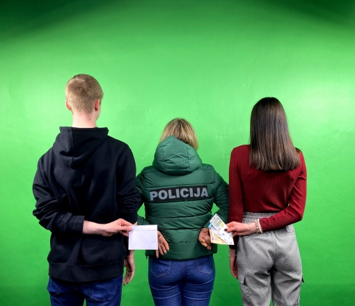 Nuotraukose pateikti keli vienas su kitu susiję veiksmai: duodamas kyšis, asmuo pastebi nelegalų veiksmą, keliauja link vietos, išskiriami asmenys, pasekmės už kyšio ėmimą.