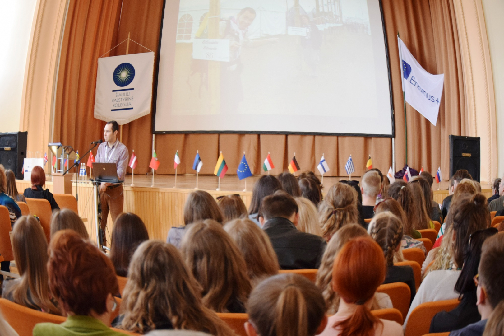 Tarptautinių ryšių ir projektų valdymo skyriaus vedėja Kristina Nesovienė supažindino su programos ERASMUS+ istorija, jos teikiamomis galimybėmis ir įspūdingais skaičiais: Lietuva prie programos prisijungė 1999 metais, per tą laiką į užsienį išvyko daugiau nei 50 000 studentų. Nuo 2004 metų pagal ERASMUS+ į užsienį buvo išvykę 650 Šiaulių valstybinės kolegijos studentų. Kolegija turi 114 tarptautinių partnerių.
