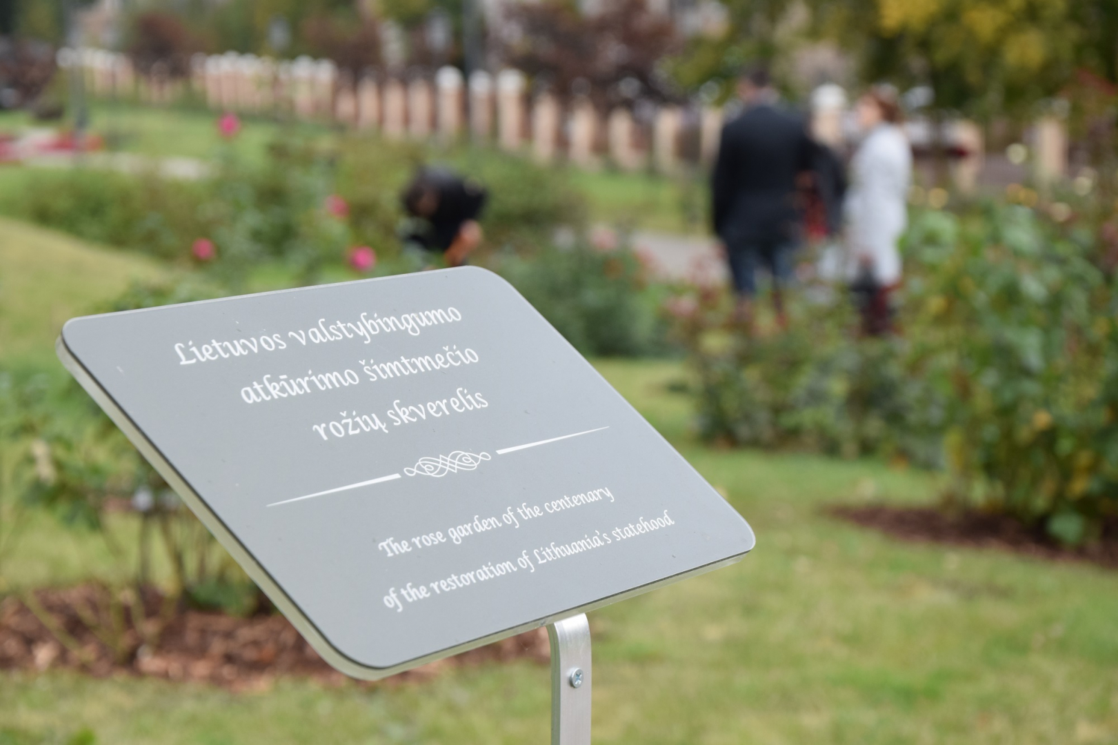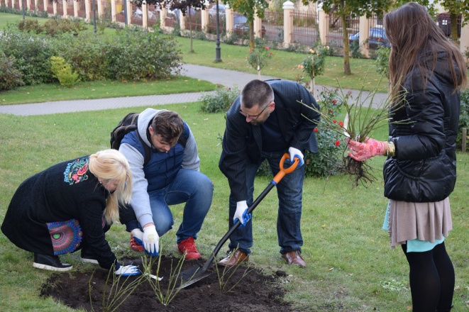 Kuriamame Chaimo Frenkelio vilos rožyne susirinkę Šiaulių valstybinės kolegijos dėstytojai ir kiti darbuotojai pedagogų profesinės šventės proga pasodino Mme Knorr veislės rožių krūmą.