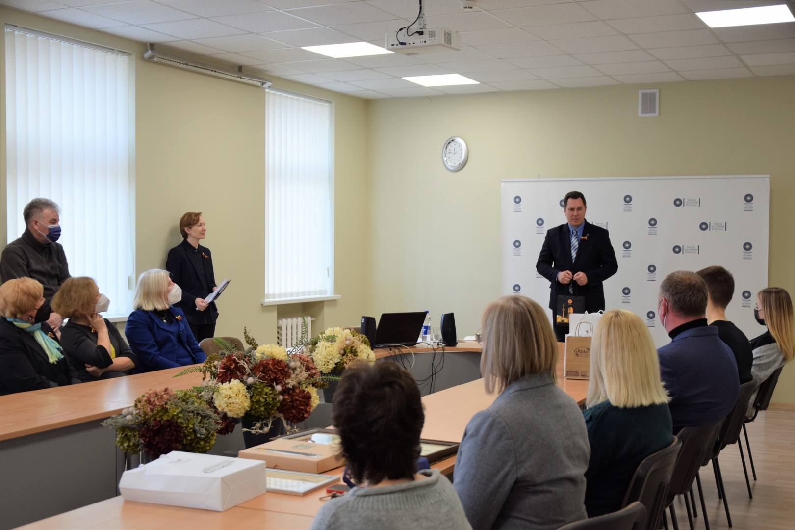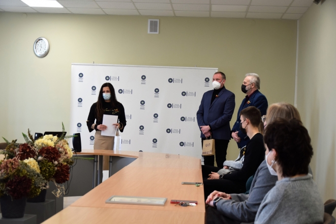 Kazimiero Šavinio premijos laureatą studentą Tadą Jonaitį pristatė Verslo ir technologijų fakulteto dekanė dr. Ingrida Vaičiulytė, Inžinerijos mokslų katedros vedėjas Saulius Palepšaitis ir Tado grupės kuratorius, Inžinerijos mokslų katedros lektorius Deividas Nesovas.
