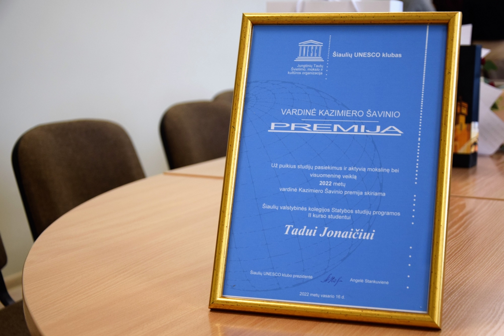 Šiaulių UNESCO klube įsteigta vardinė Kazimiero Šavinio premija – Šiaulių valstybinės kolegijos inžinerijos mokslų studentams skirtą apdovanojimą nutarta įteikti Statybos studijų programos antrakursiui Tadui Jonaičiui.