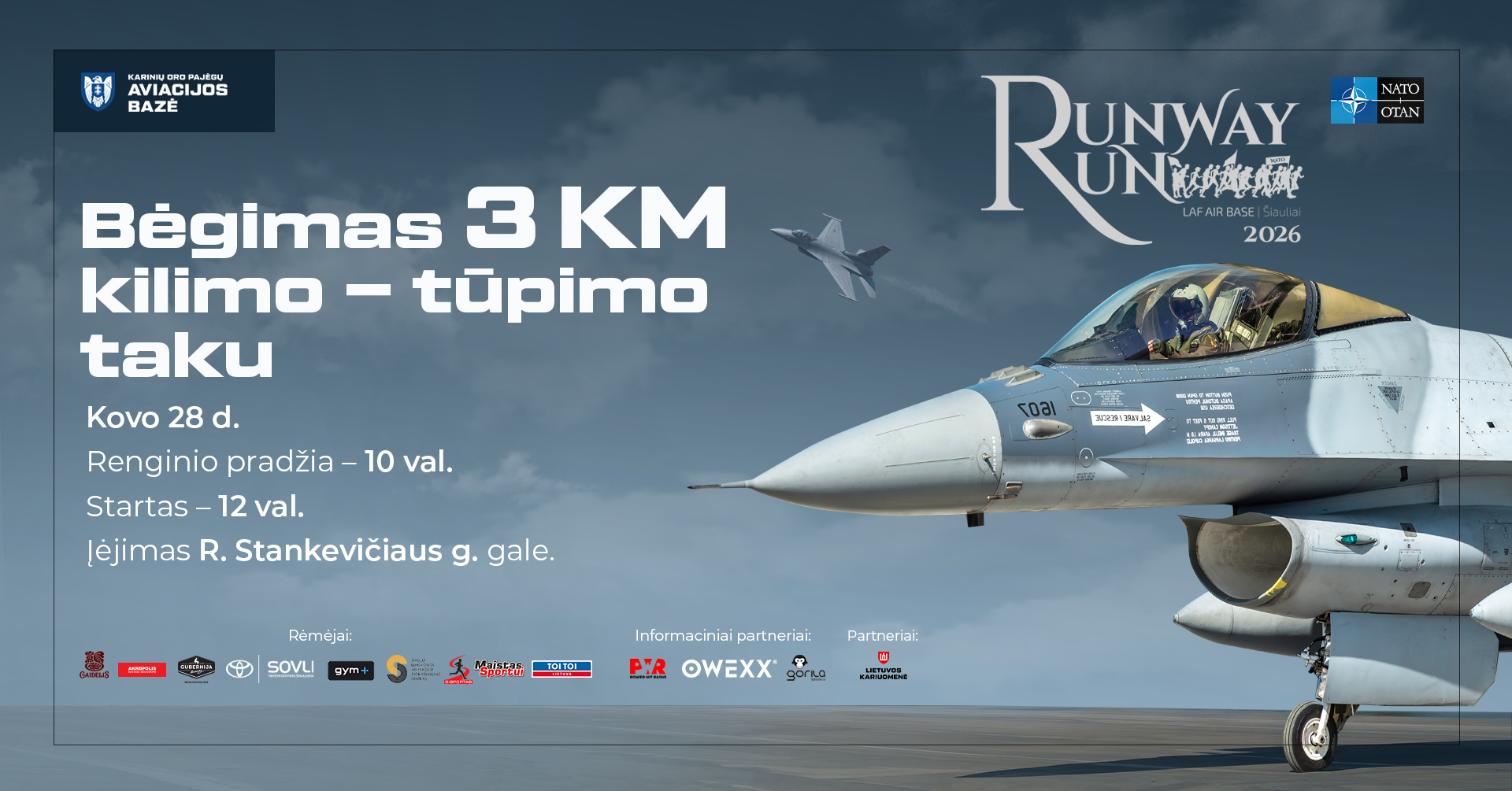 Runway Run '26 is one-of-a-kind running event in Lithuania, taking place on the runway where Lithuanian Air Force aircraft take off and land, along with NATO Baltic Air Policing mission fighter jets from allied countries. The purpose of this run is to remind us that we have been a part of the strongest military alliance, NATO, for 22 years, counting from 29 March 2004.