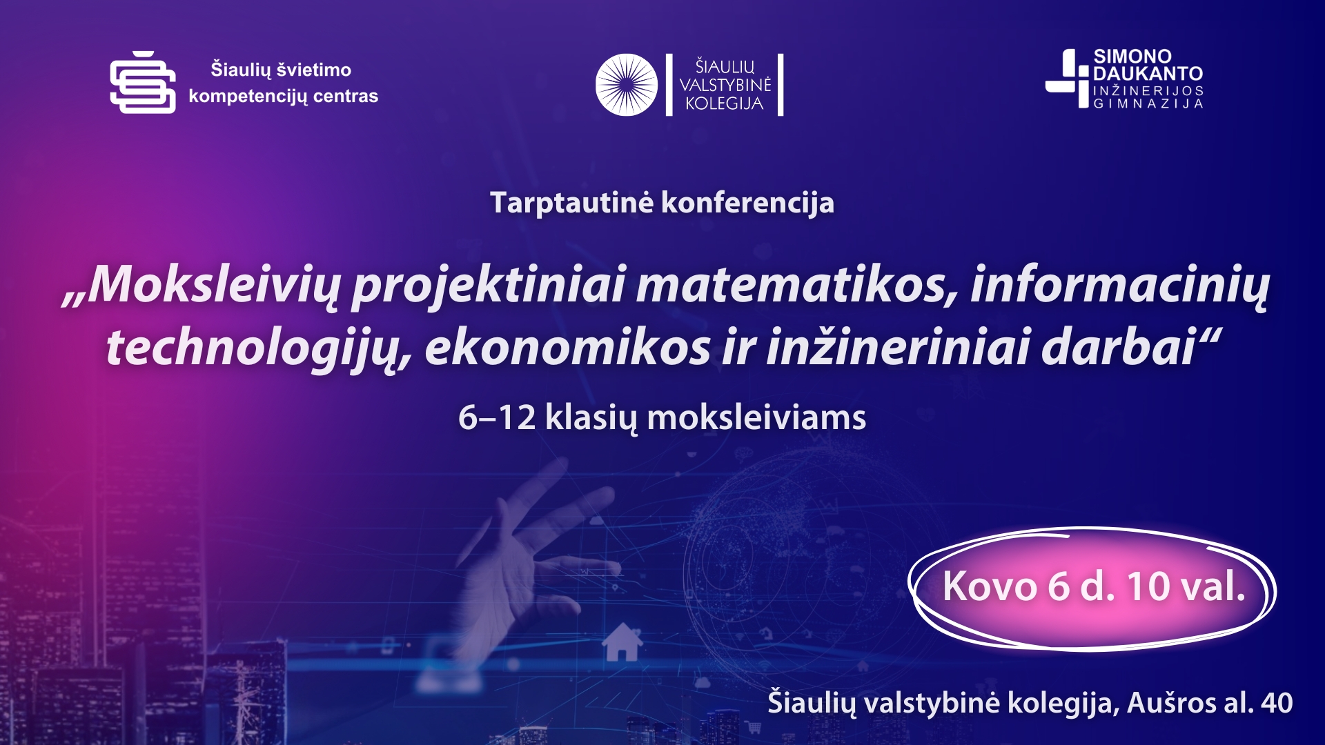 Šiaulių Simono Daukanto inžinerijos gimnazija ir Šiaulių valstybinė kolegija kviečia 6–12 klasių moksleivius 2026 m. kovo 6 d. (penktadienį) dalyvauti XXV tarptautinėje moksleivių projektinių matematikos, informatikos, ekonomikos, verslumo ir inžinerinių darbų konferencijoje, kuri vyks Šiaulių valstybinėje kolegijoje, adresu Aušros al. 40, Šiauliai.