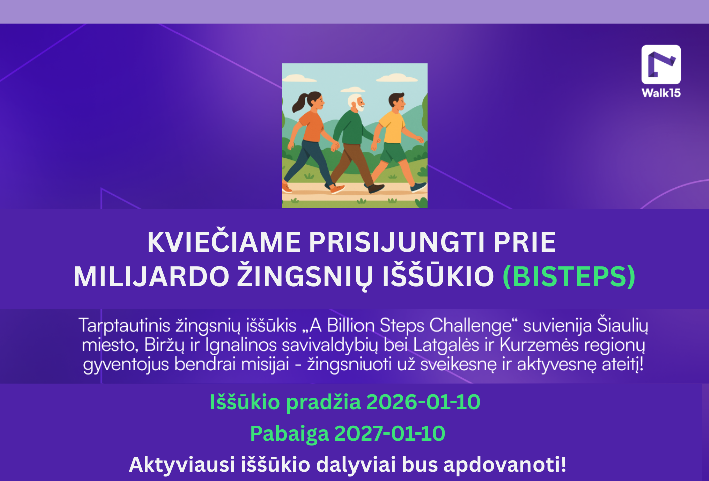 Kviečiame prisijungti prie tarptautinio fizinio aktyvumo projekto – „Milijardo žingsnių iššūkio (BISTEPS)“, skirto įvairaus amžiaus žmonėms.