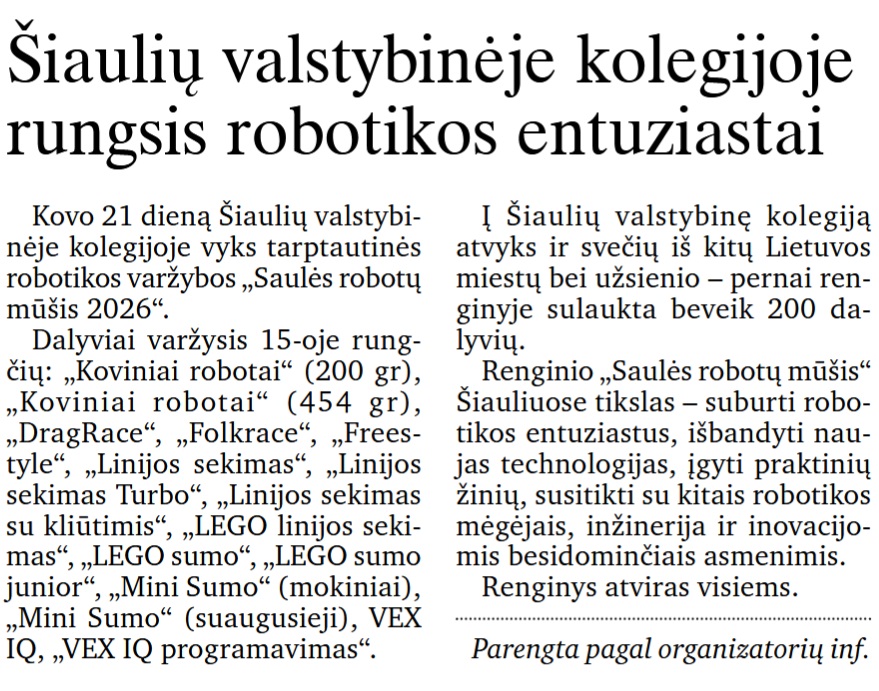 Šiaulių valstybinėje kolegijoje rungsis robotikos entuziastai